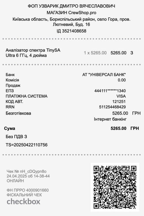 - Аналізатор спектра TinySA Ultra 6 ГГц — 5265 грн.